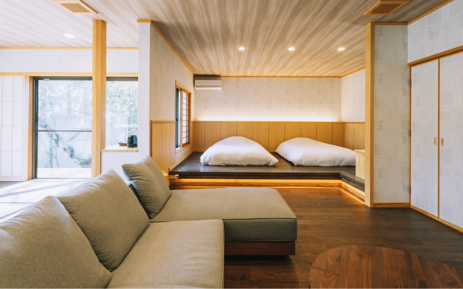 内風呂、露天風呂、バレルサウナ付き離れ客室